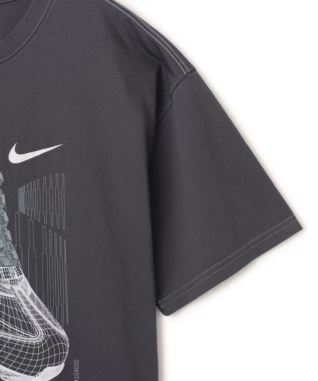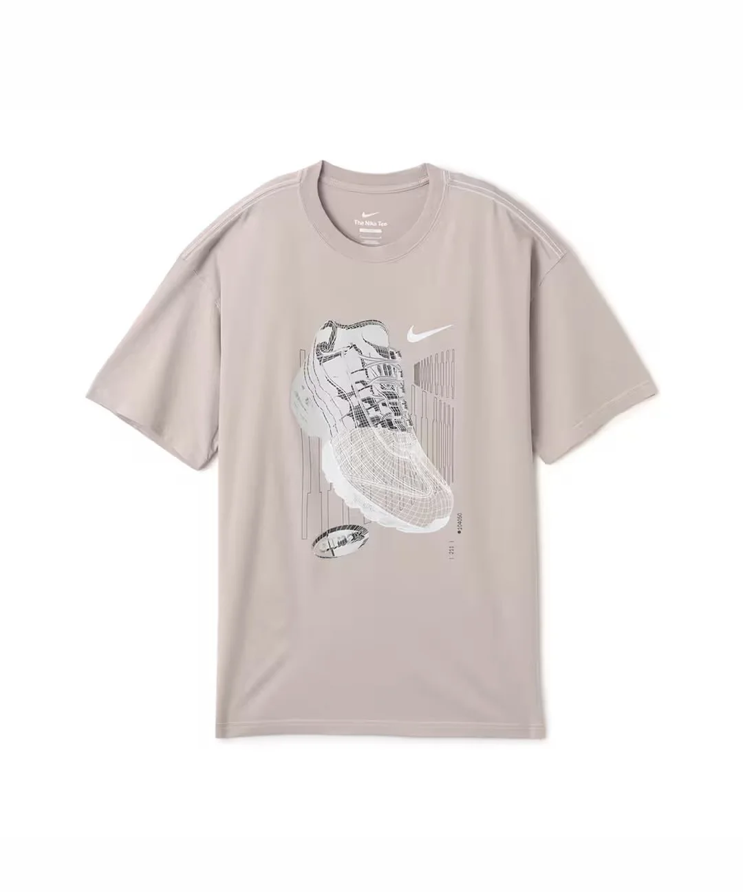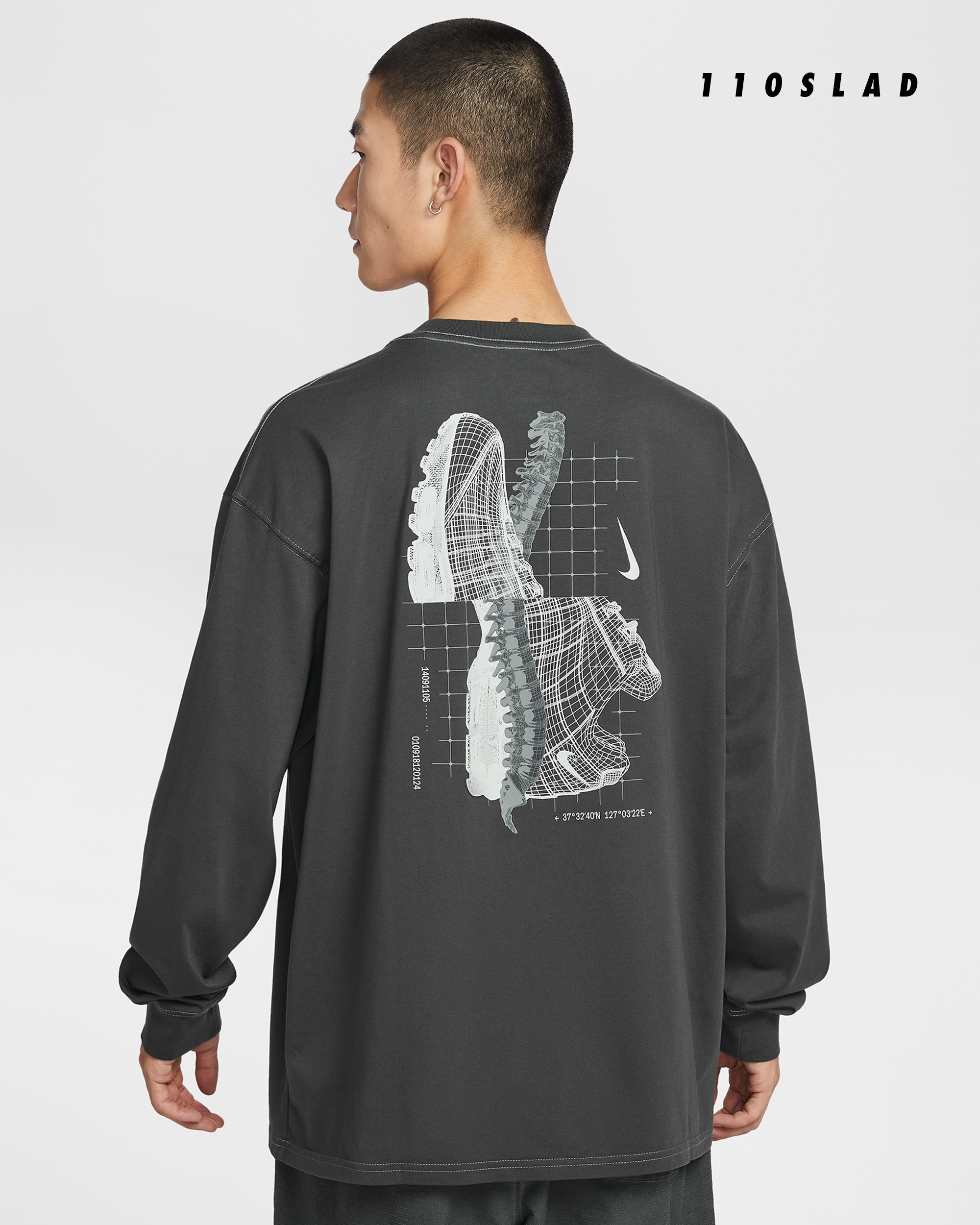 The prints feature a technical, blueprint style graphic inspired by the iconic Air Max 95 silhouette. The design breaks the shoe down into layered wireframe renderings, intersected by grid lines that give it a futuristic look. On the long sleeve shirt a spine like structure runs vertically through the center, nodding to the human anatomy inspiration behind the Air Max 95. Subtle numeric codes and geographic coordinates add a data driven, experimental feel, while a small Nike Swoosh sits cleanly to the side.
