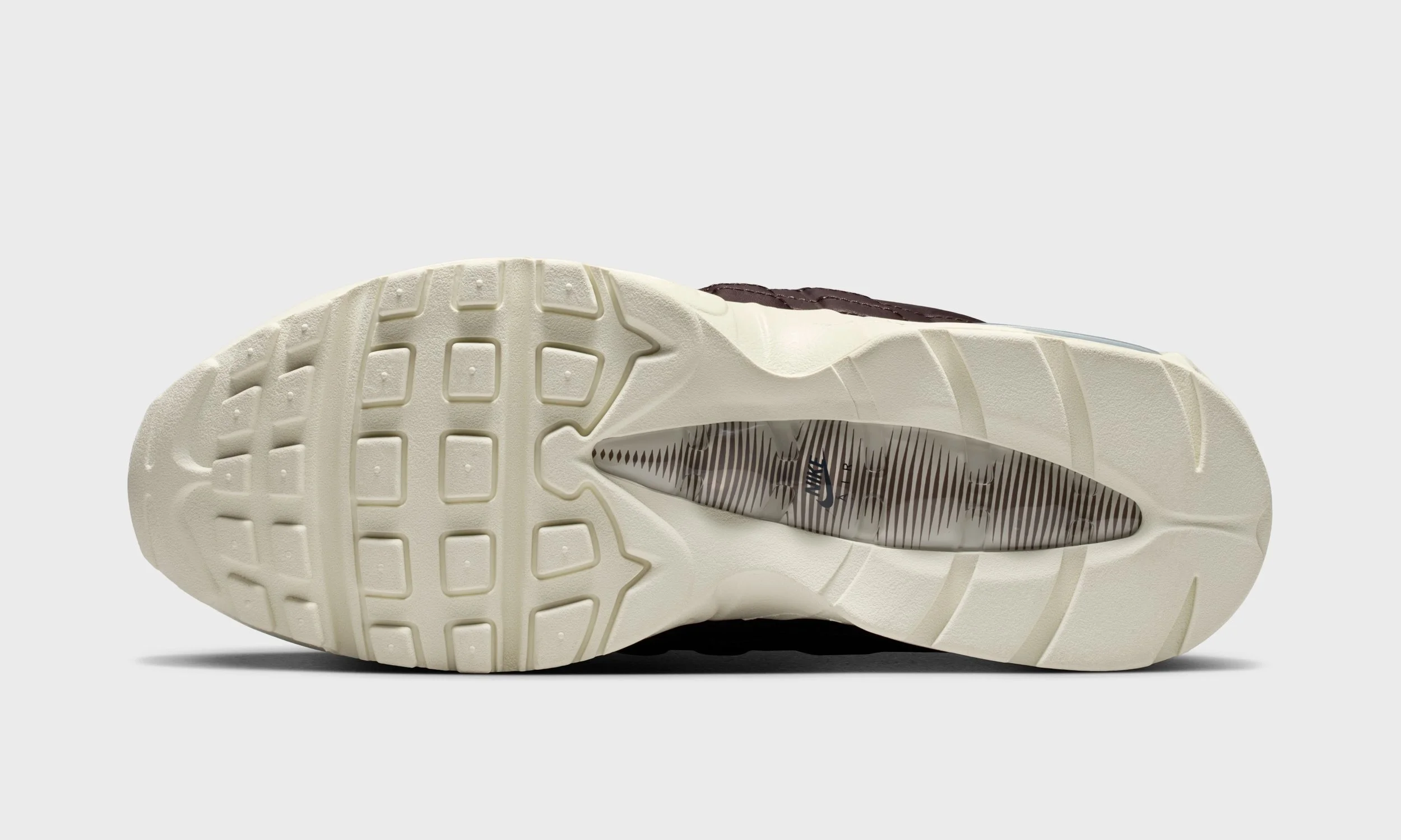 The upper is dressed entirely in Baroque Brown leather, giving the shoe a smooth, uniform look that feels more elevated than the standard mesh based releases. The layered panels blend together subtly, creating depth through texture rather than colour changes. It’s a quieter take on the 95, but one that still carries weight thanks to the richness of the leather and the depth of the brown tone.