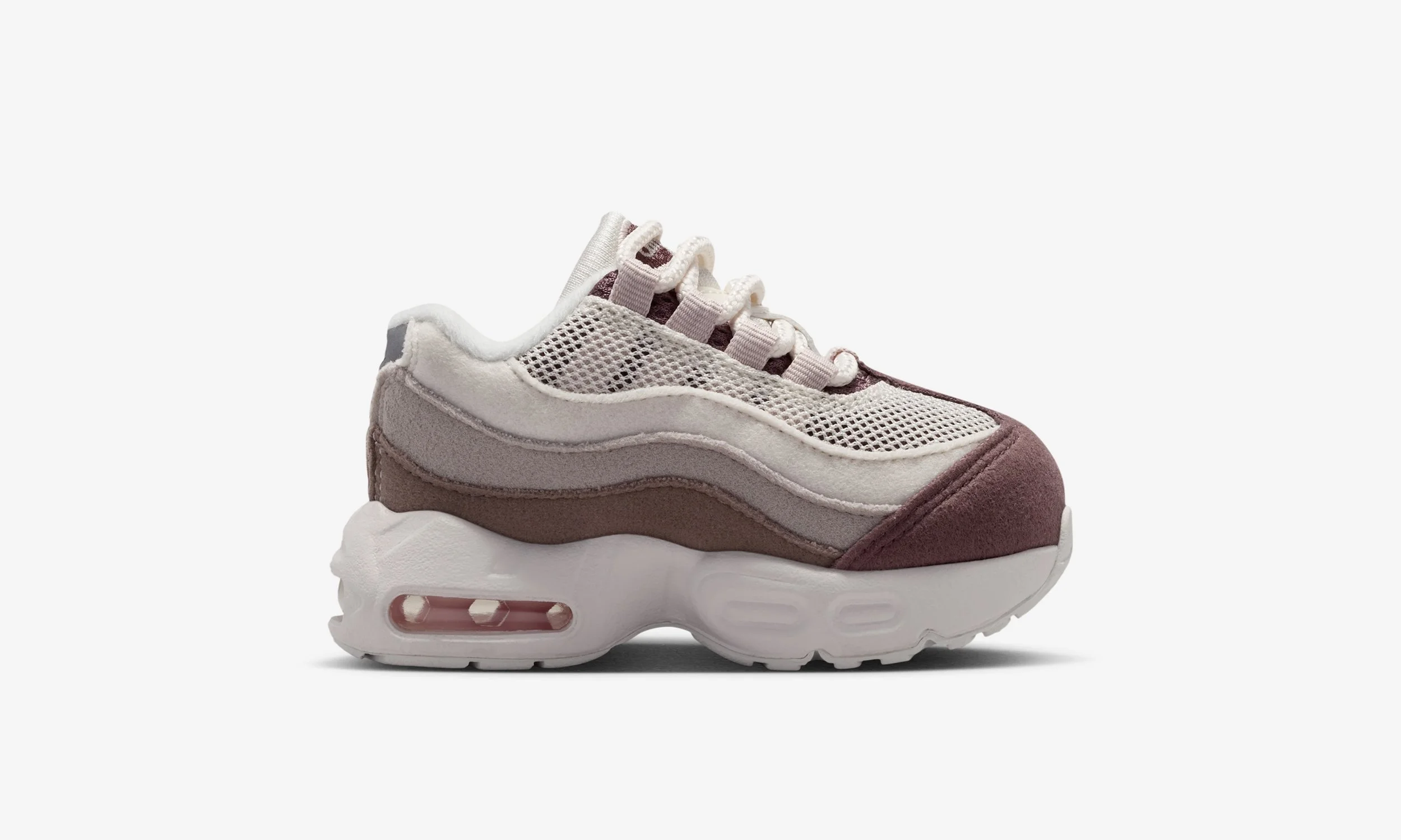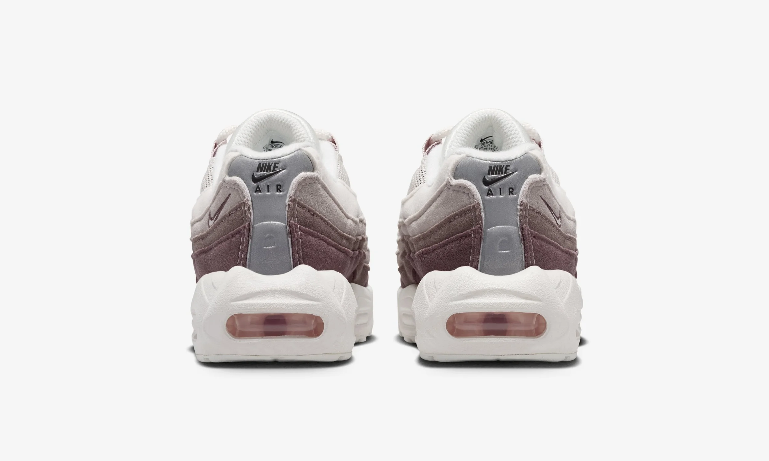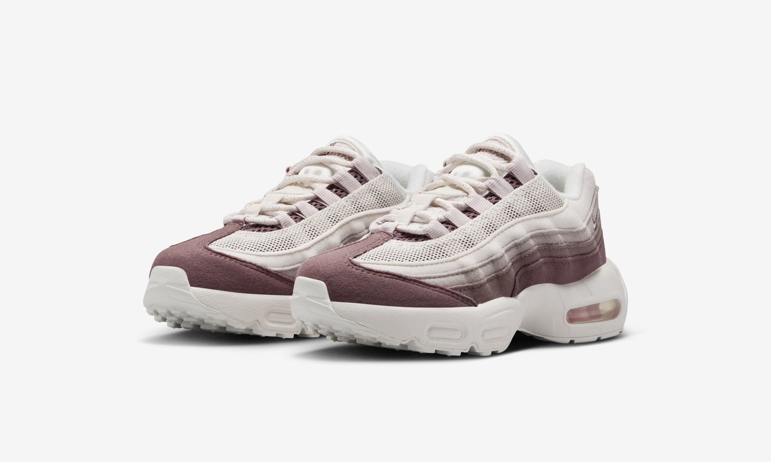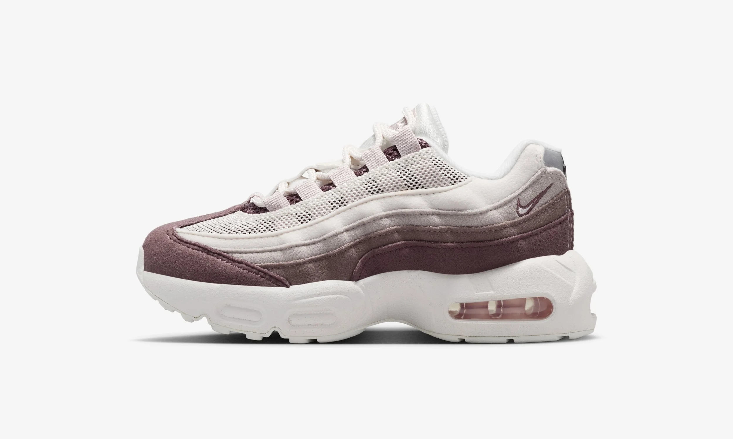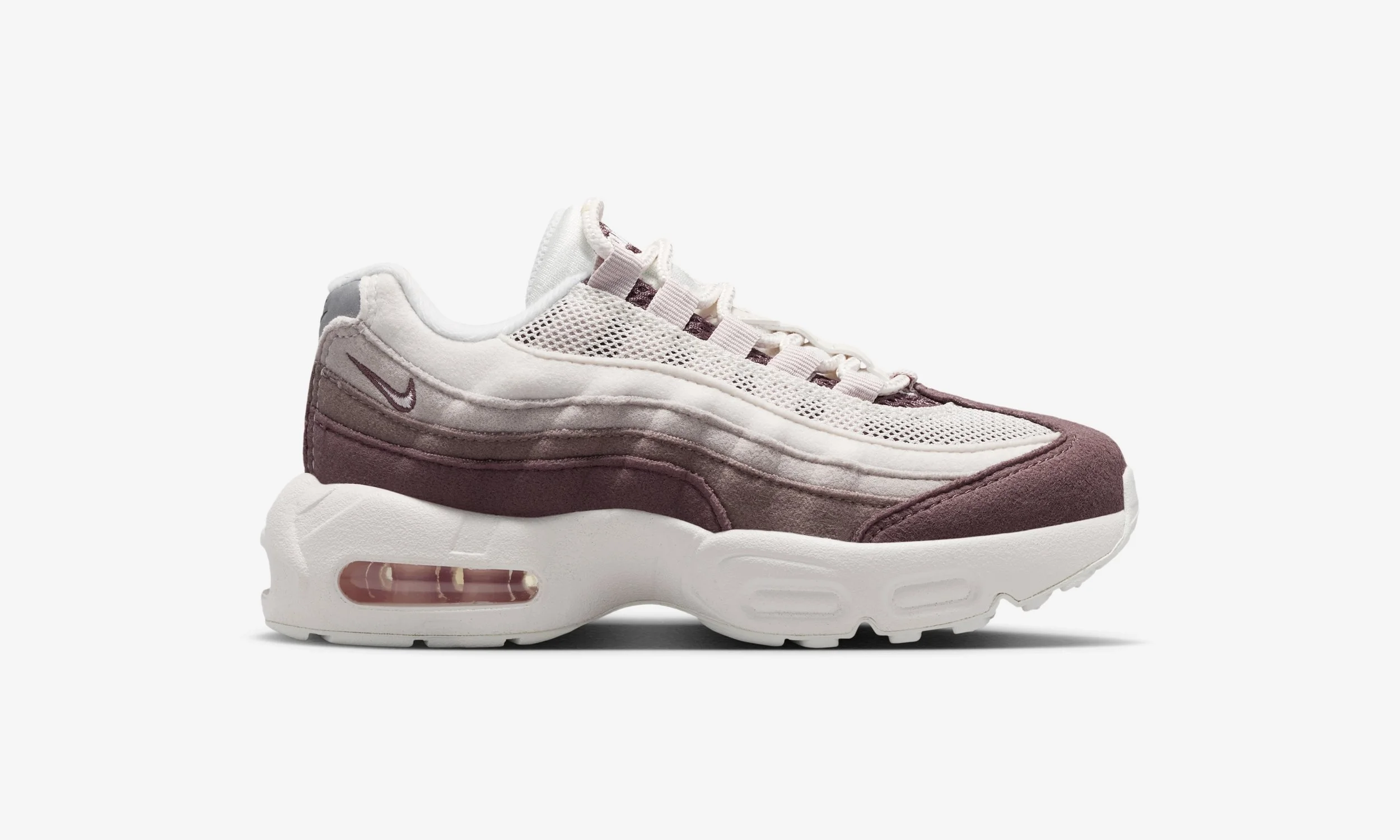 One of the standout features of this release is the all-suede upper. The layered panels synonymous with the Air Max 95 design are executed in soft tonal shades, blending Phantom and Moon Particle with deeper Silt Red accents. The result is a premium look that elevates the sneaker beyond a standard kids’ release, while still maintaining durability for daily wear.