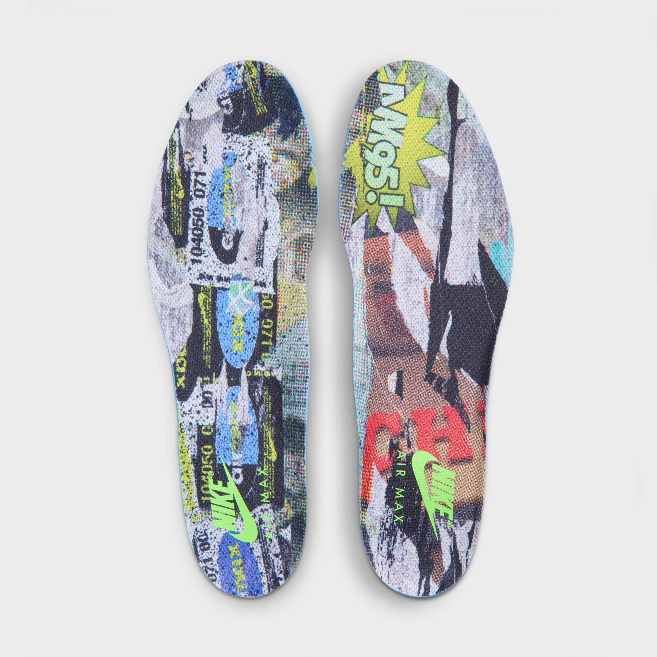 Underfoot, the storytelling continues on the insoles with a set of graphics rooted in the city’s 90s youth culture. The Air Max 95 branding is reworked in the bold, playful style of classic teen magazines like Yes! magazine, channeling the energy of the era rather than referencing it outright. Alongside that sits a nod to “Chicago,” the legendary Japanese sneaker store that once supplied rare imports to Hong Kong collectors, plus a hidden throwback for longtime heads: the original Air Max 95 Neon SKU stamped onto the insole as a subtle piece of Air Max history.