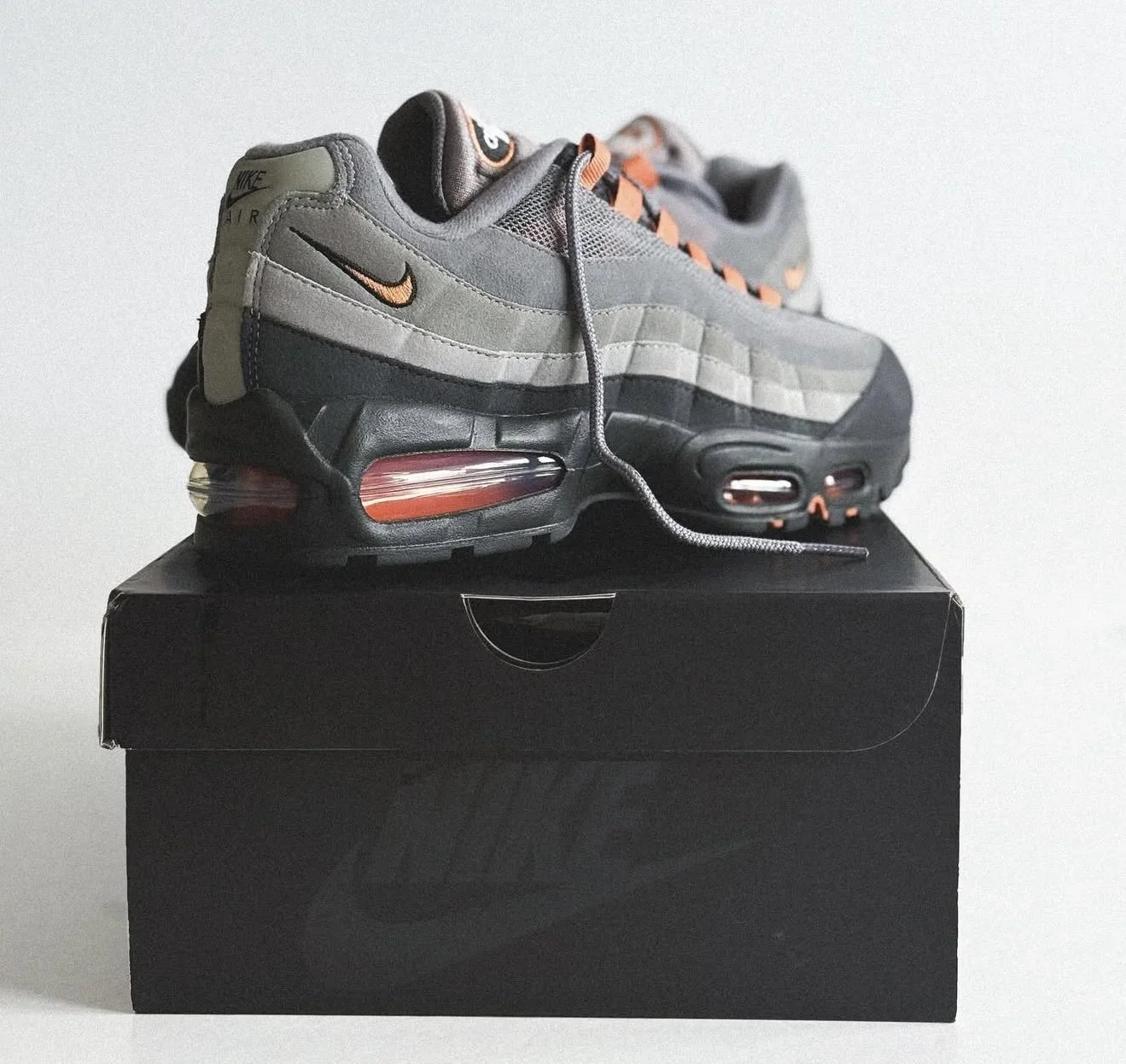 The “Hot Curry” hits are used sparingly but effectively. Small pops of burnt orange show up on the lace loops, mini Swoosh at the heel, tongue branding, and inside the visible Air units, breaking up the dark palette without overpowering it. Grey rope laces keep things cohesive, while the black midsole and outsole anchor the whole design with a clean, no nonsense finish. It’s a simple formula, but it works, earthy tones that feel easy to wear with just about anything.
