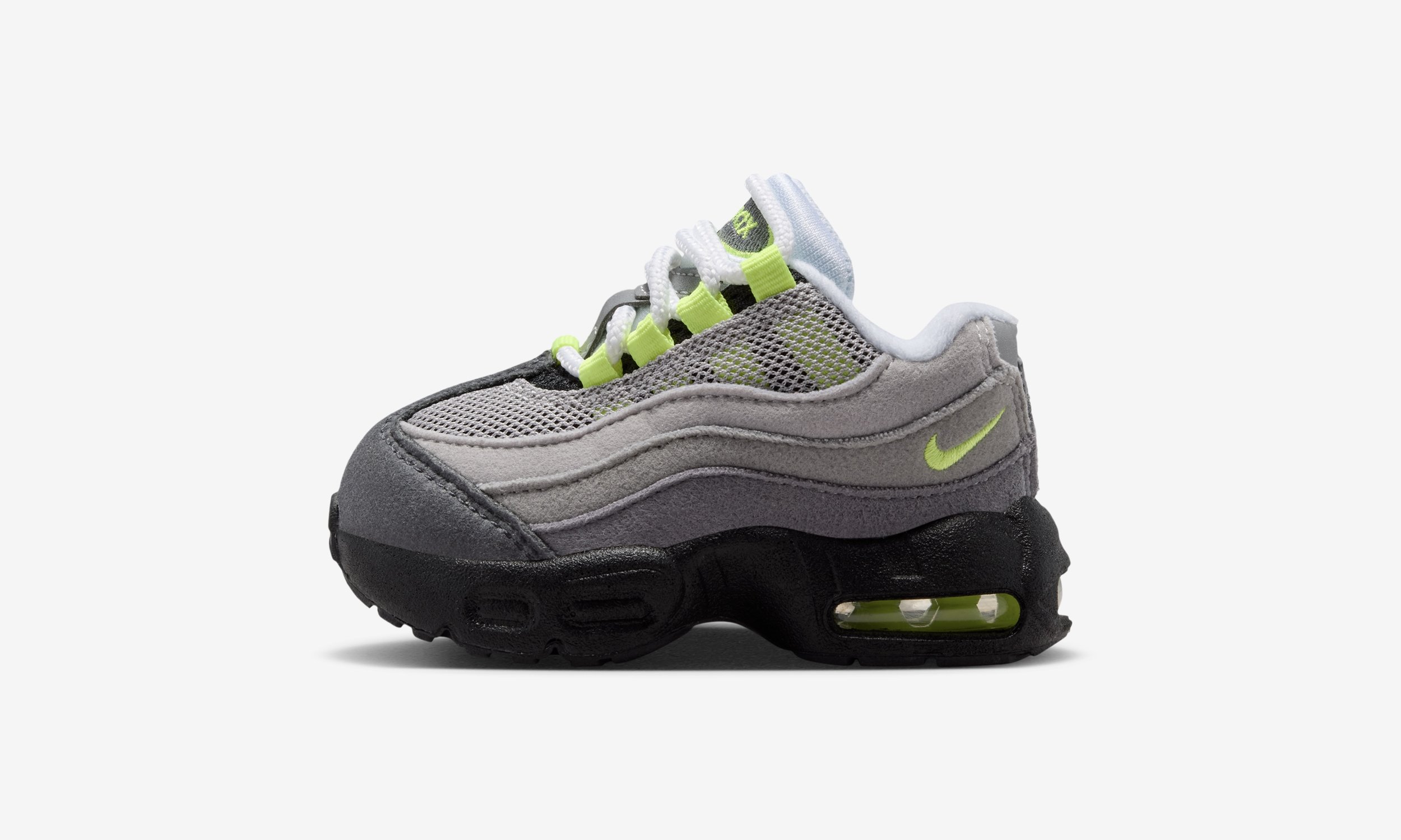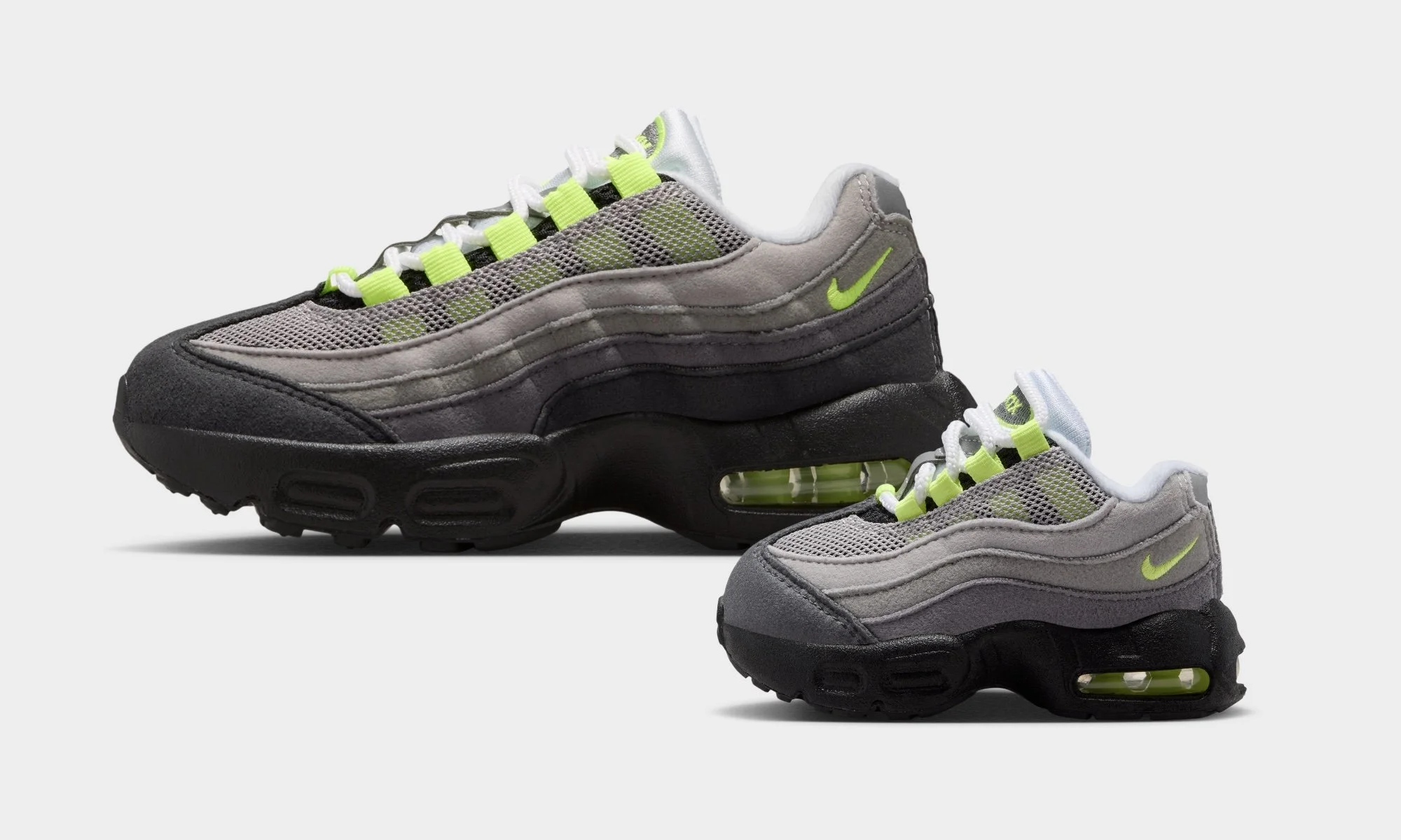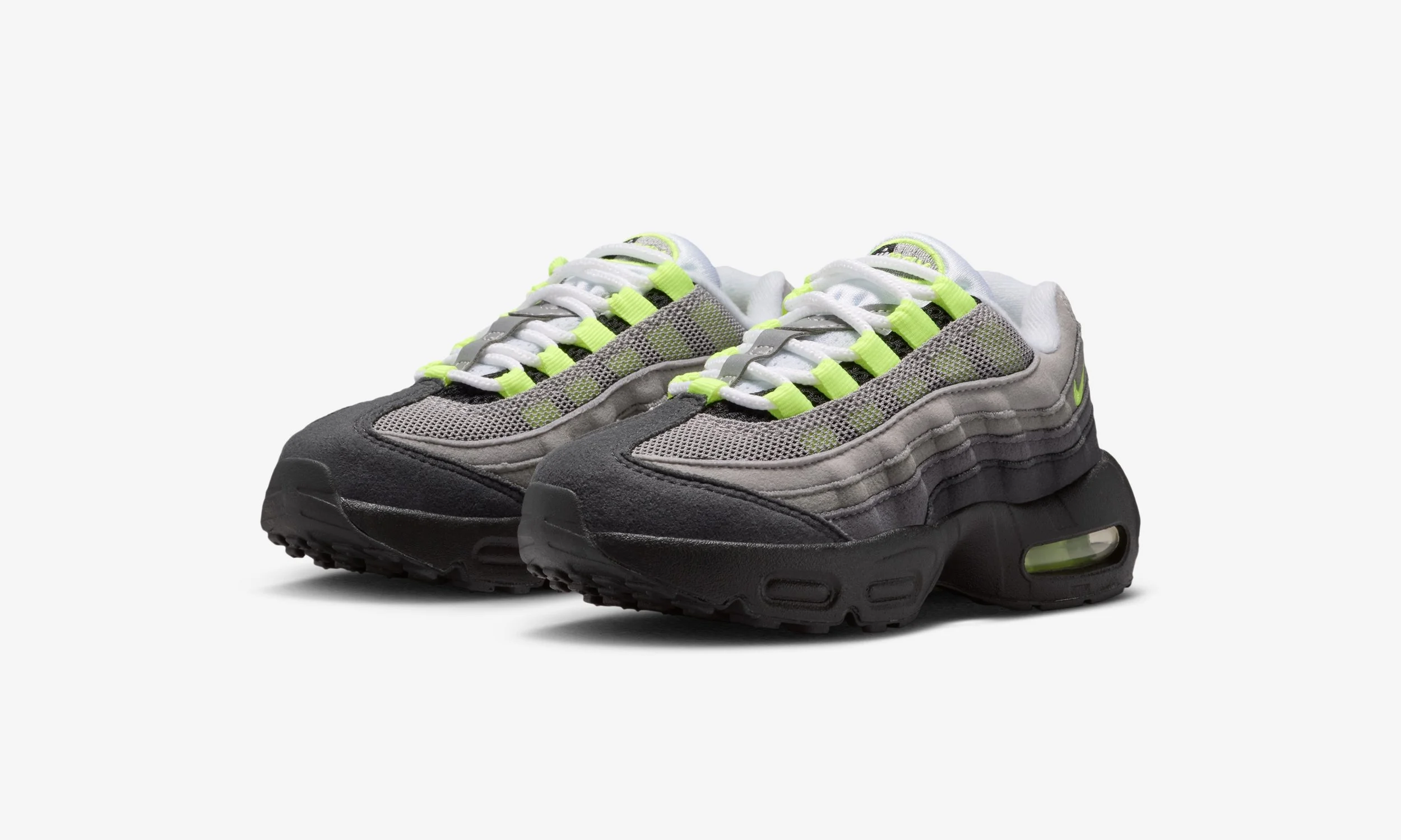 The Nike Air Max 95 “Neon” has now released in the U.S. in kids sizing, with Grade School (GS) and Preschool (PS) pairs available. A wider release is still expected, with no confirmed dates yet for other regions.