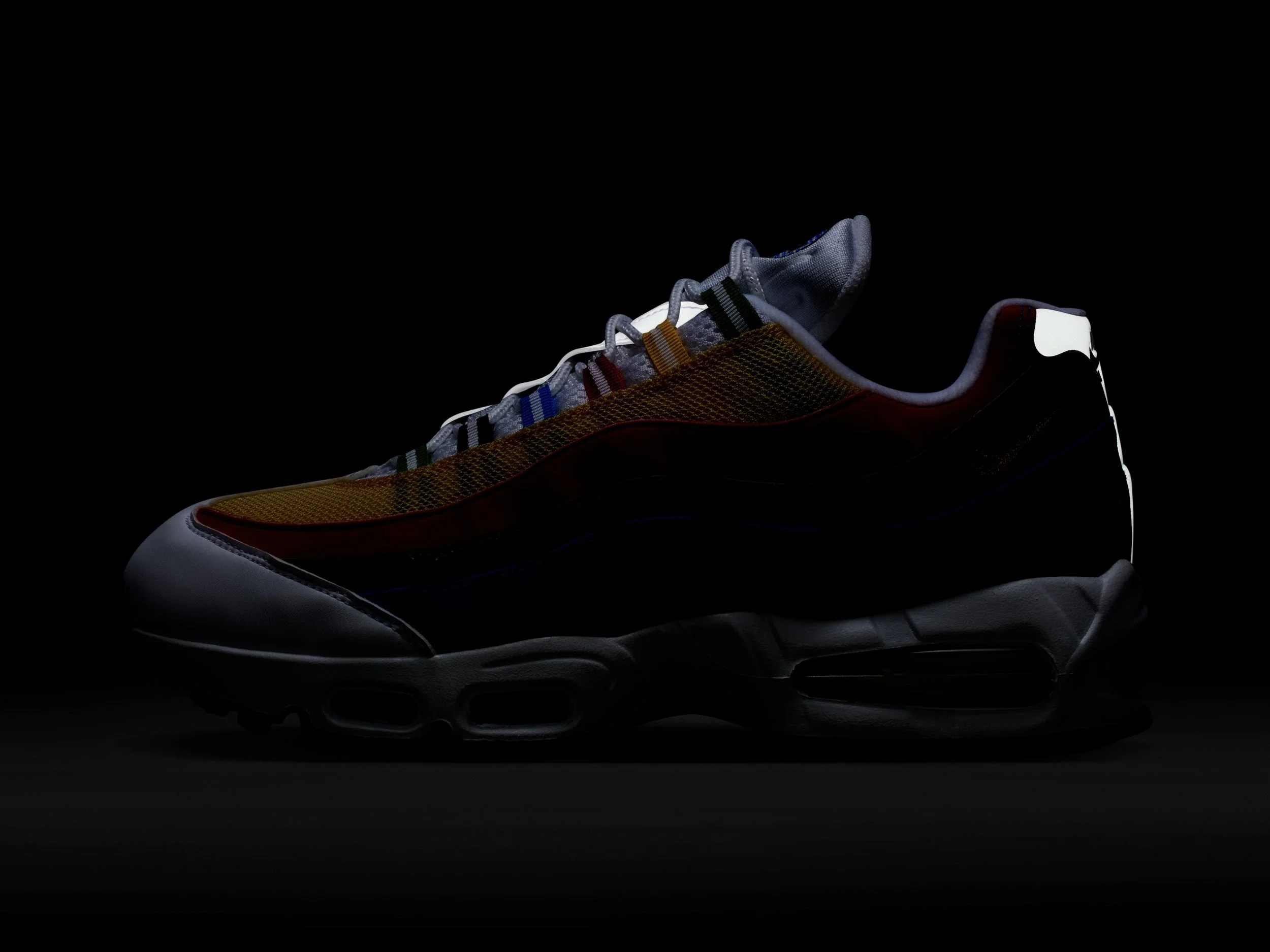 This updated version is built on a crisp white base, but that clean foundation is quickly overtaken by a sweep of colour that runs through the signature layered panels. Yellow mesh dominates the upper, giving the shoe an almost race-day feel, while bold red, green, and blue leather waves cut across the sides in classic 95 fashion. Black grounds the lower portion of the upper, adding contrast and keeping the brighter colours from feeling too chaotic. The metallic gold Swoosh at the heel is subtle but intentional, acting as a quiet nod to podium finishes without stealing attention from the rest of the design.