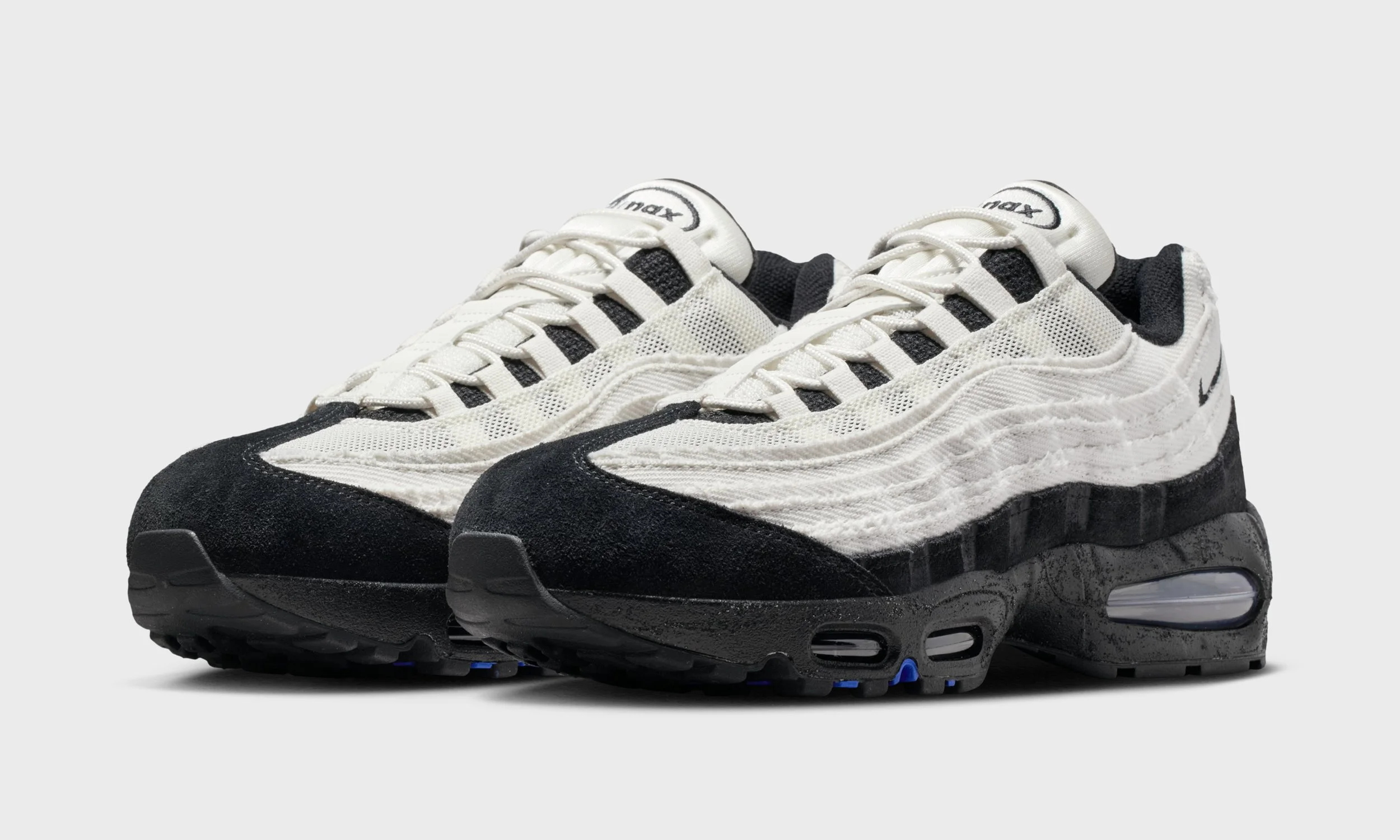 Across the pair, the Air Max 95’s signature layered upper is rebuilt with raw textiles, open mesh, heavy canvas, and rugged suede, replacing smooth, traditional finishes with fabrics that feel tactile and honest. Edges are intentionally frayed, stitching is left visible, and panels look cut and reconstructed in a workshop setting. The imperfections feel deliberate, celebrating process over polish.