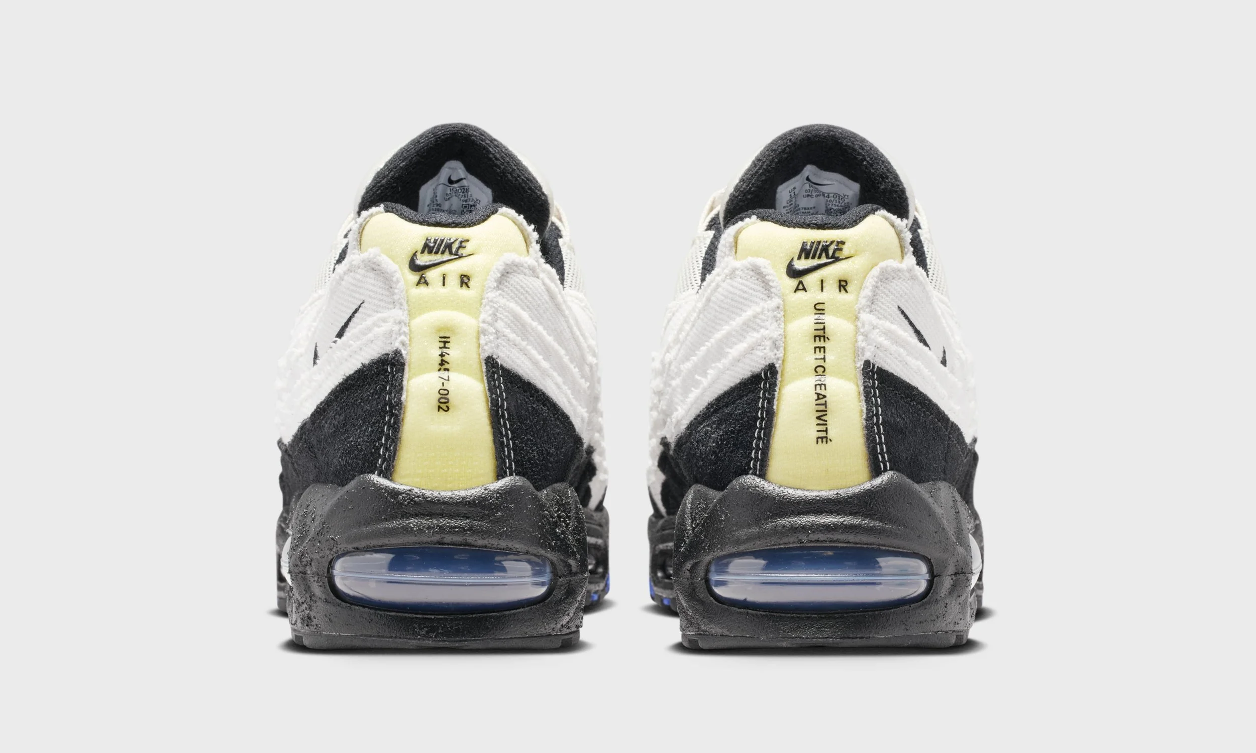 That balance between production and creativity shows up elsewhere, too. One heel is printed with an exposed SKU code IH4457-002, the same code associated with last year’s Bright Crimson Air Max 95. How that exact style number connects to this pair isn’t entirely clear, but its visibility feels intentional, like a factory stamp left on the outside as part of the design language. On the opposite heel, the message shifts from technical to human: “Unité et Créativité”, Unity and Creativity, a simple phrase that captures the spirit of the collection and the idea of different communities building something together.