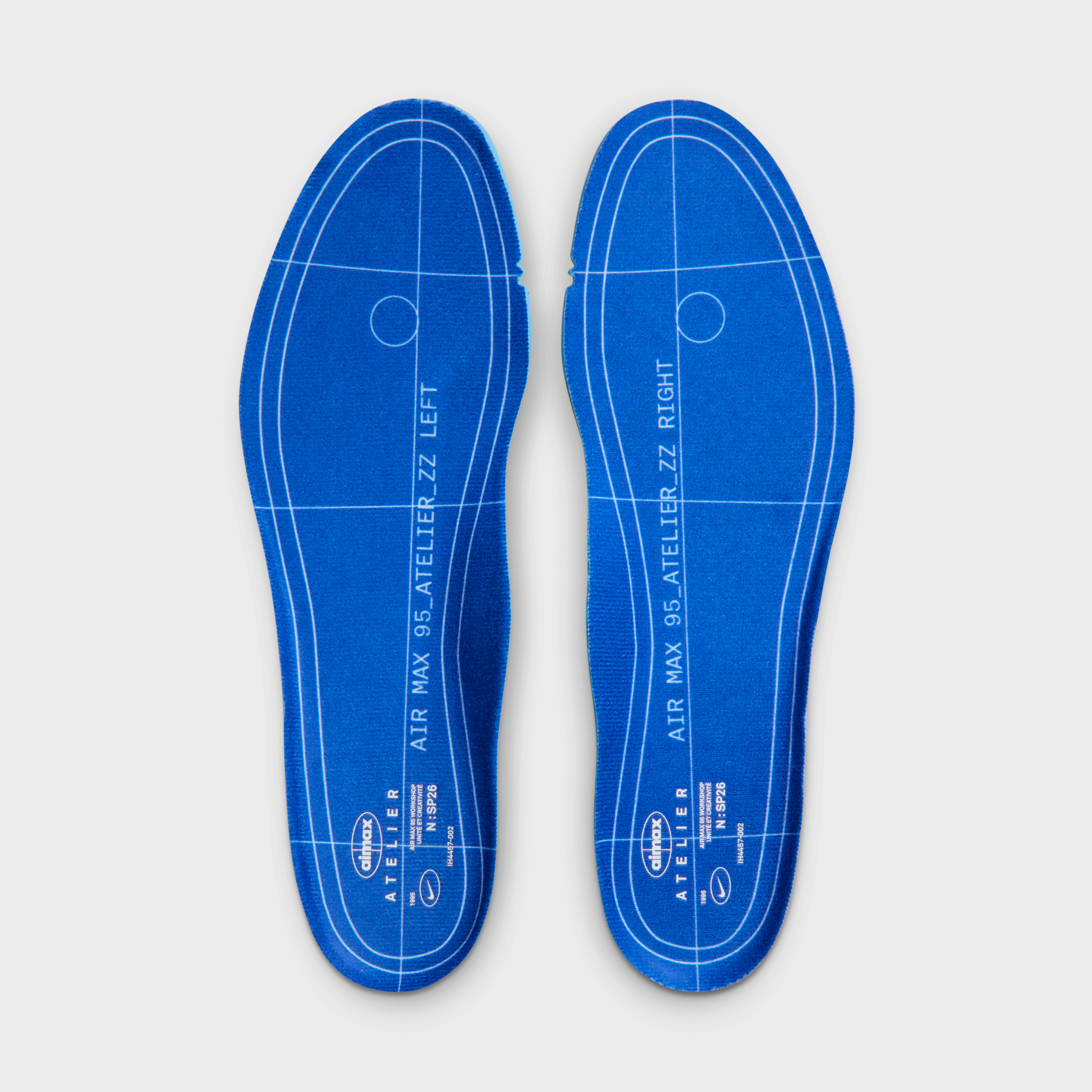 Inside, the theme becomes even more literal. Blueprint-style insoles labeled “Atelier” reference the design studio, complete with measurement lines and technical markings, as if the shoe is still in development. It’s a nod to pattern making, prototyping, and the behind the-scenes work that usually stays hidden.