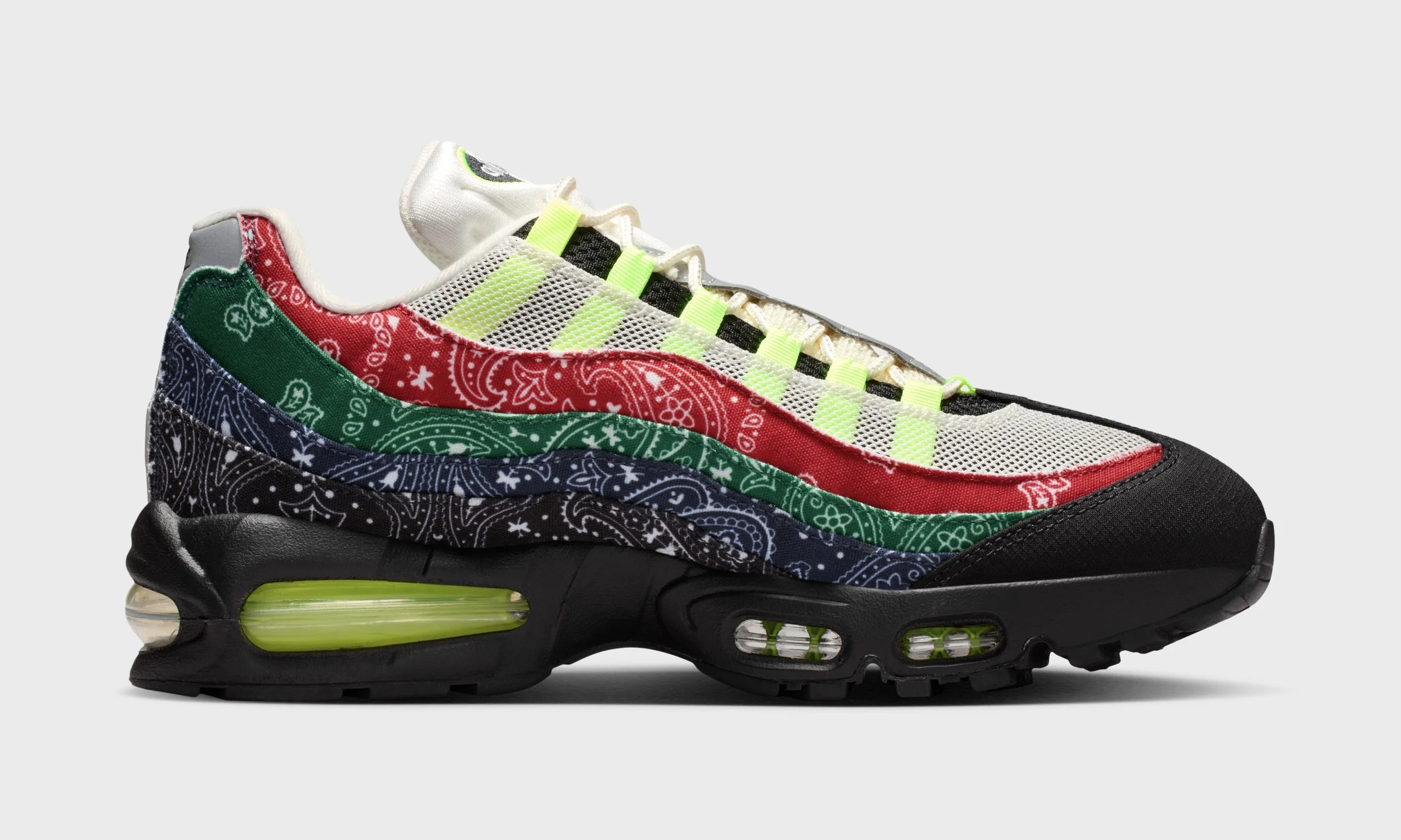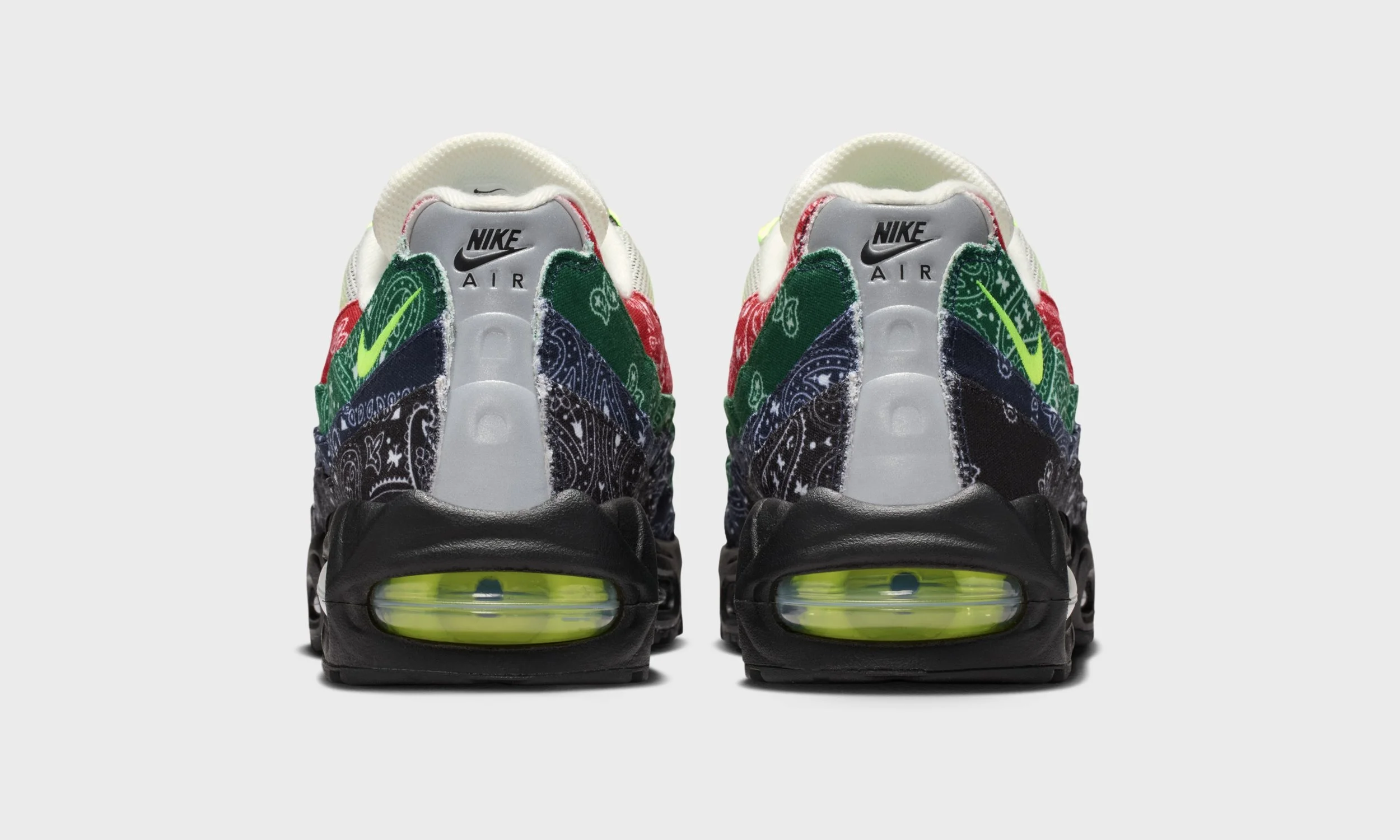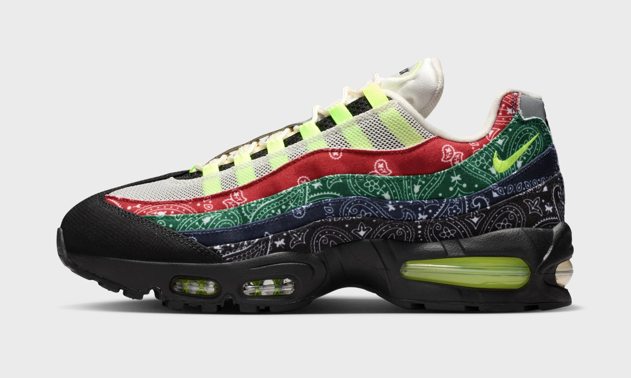 The side panels are where things shift. Instead of the usual gradient fade, the signature wavy layers are done in a full bandana-style paisley print. Four colours stack in order, red at the top, followed by green, then blue, and black at the bottom. It follows the classic 95 panel structure exactly, but the mix of prints changes the whole feel of the shoe. A small neon green Swoosh near the heel keeps the branding minimal but consistent with the brighter accents.