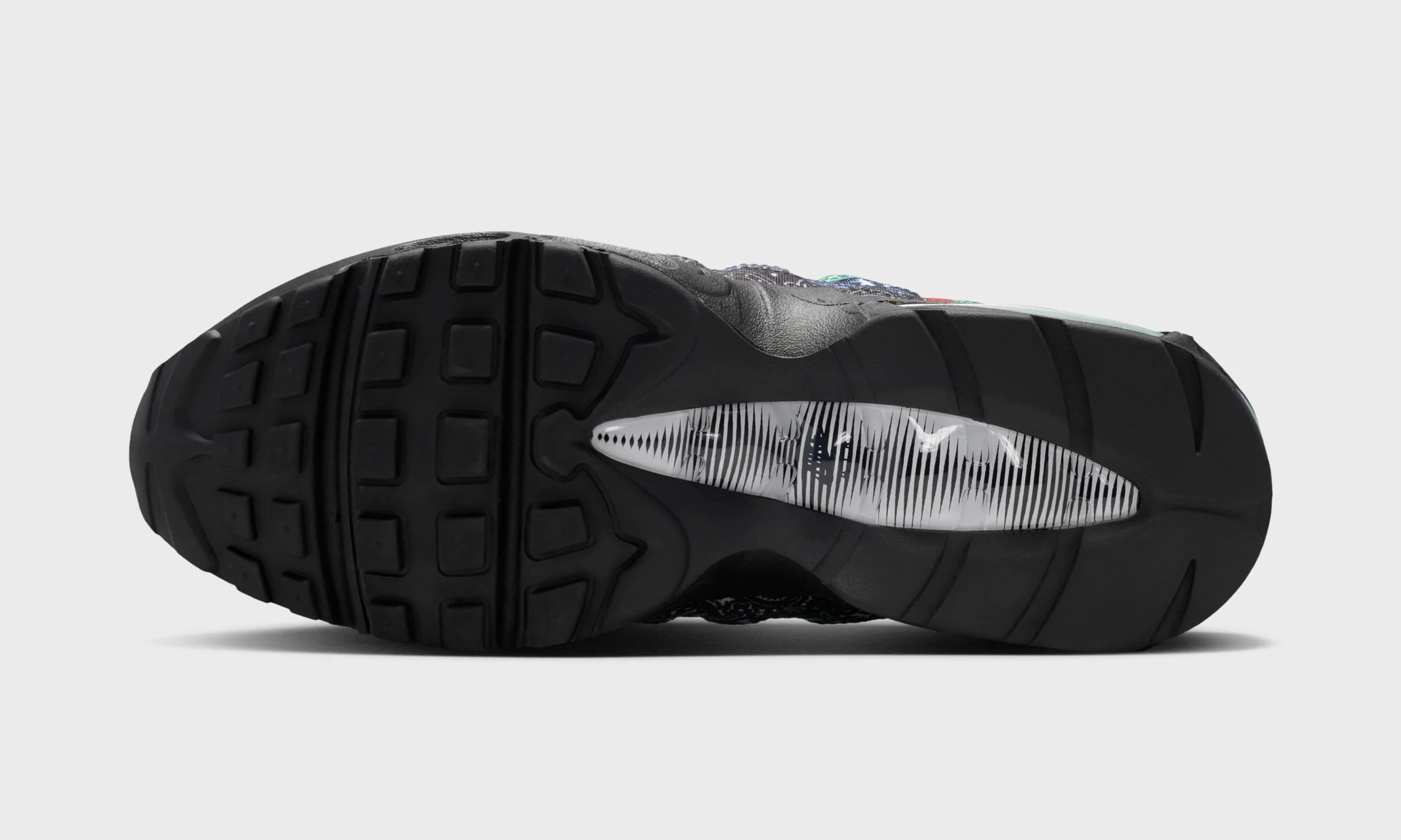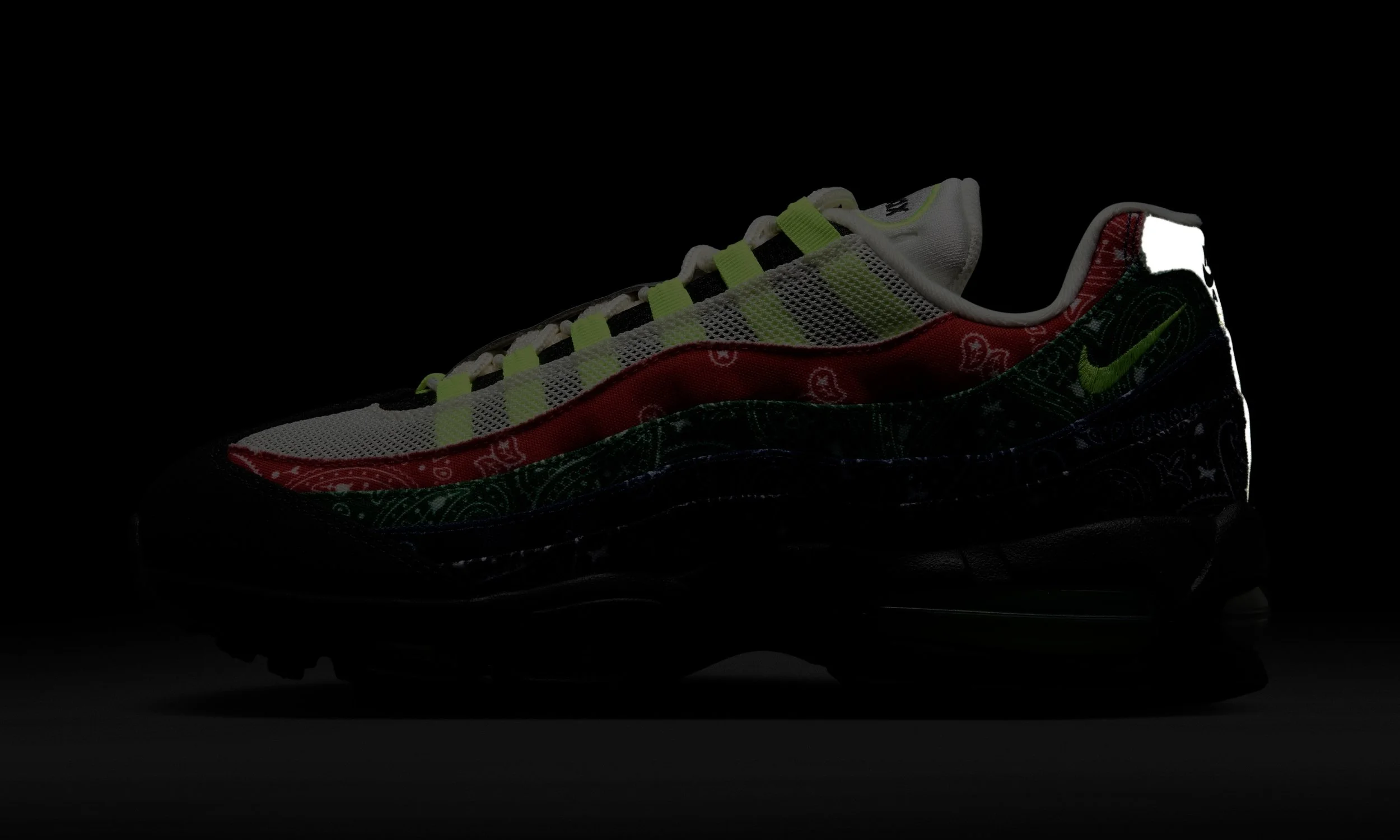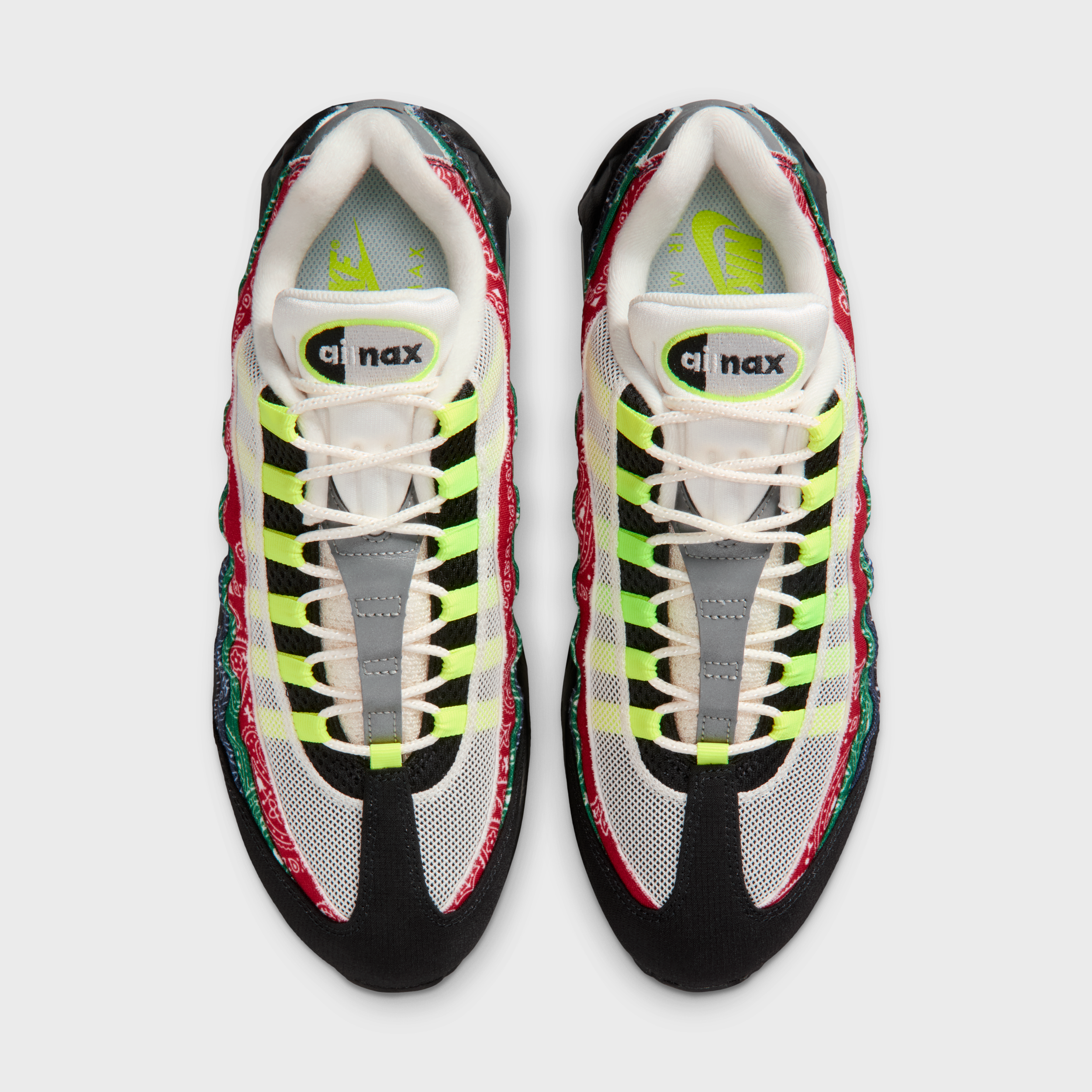 The side panels are where things shift. Instead of the usual gradient fade, the signature wavy layers are done in a full bandana-style paisley print. Four colours stack in order, red at the top, followed by green, then blue, and black at the bottom. It follows the classic 95 panel structure exactly, but the mix of prints changes the whole feel of the shoe. A small neon green Swoosh near the heel keeps the branding minimal but consistent with the brighter accents.