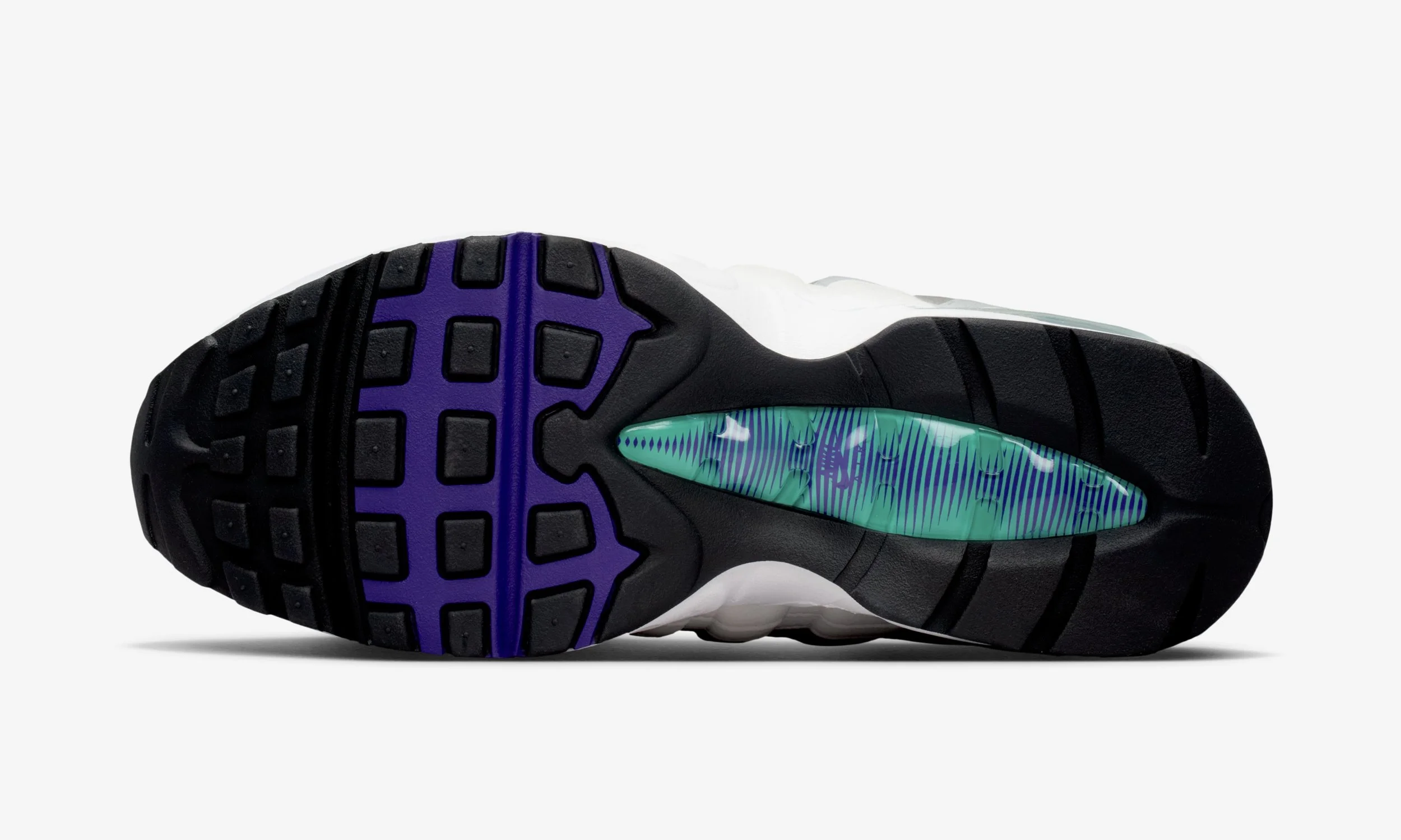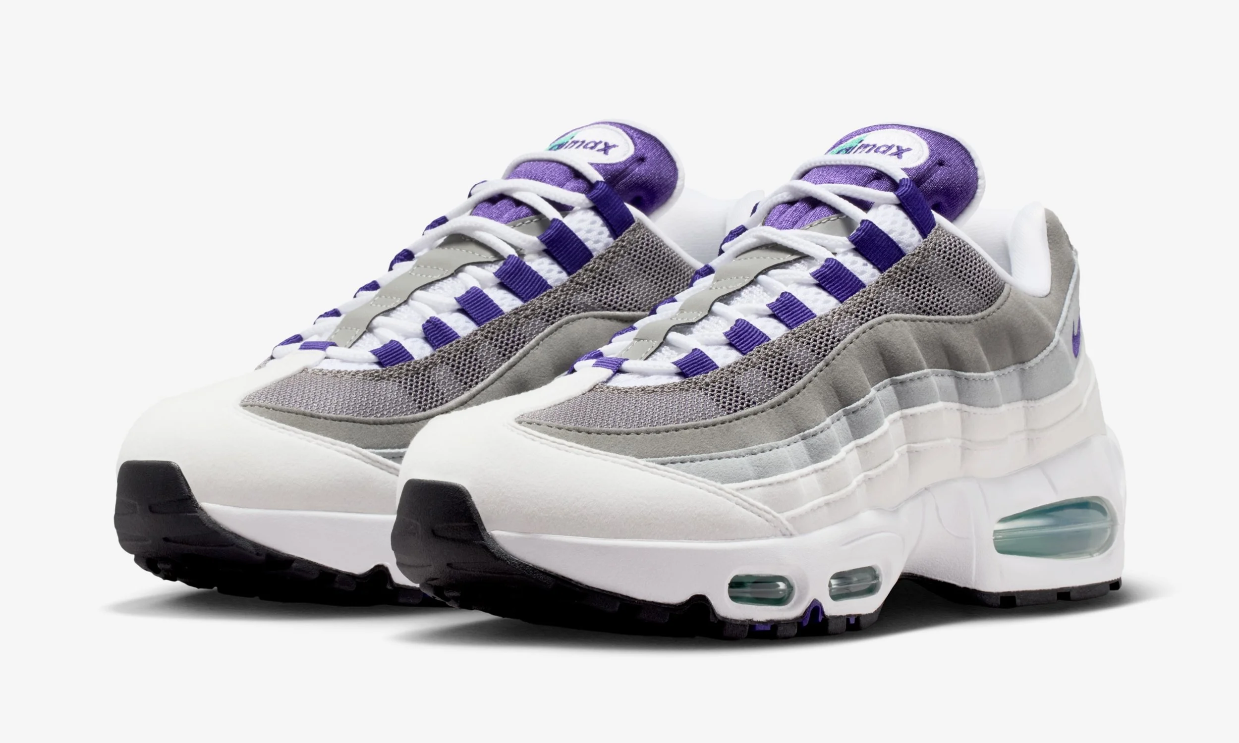 The design stays true to what made the original ‘Grape’ such a classic. The upper layers blend white and wolf grey tones in the bonded, anatomical pattern the Air Max 95 is known for, while Court Purple accents on the lace loops, tongue, and branding bring vibrant pops of colour. Underfoot, Nike upgrades the sole with an oversized visible Air unit filled with Emerald Green, giving both a throwback twist and enhanced comfort.