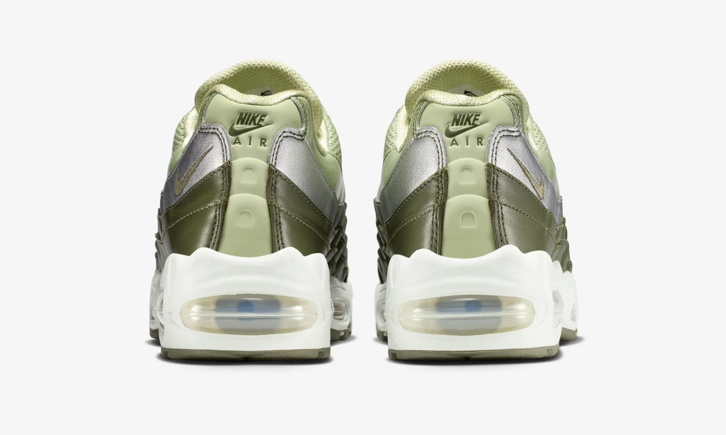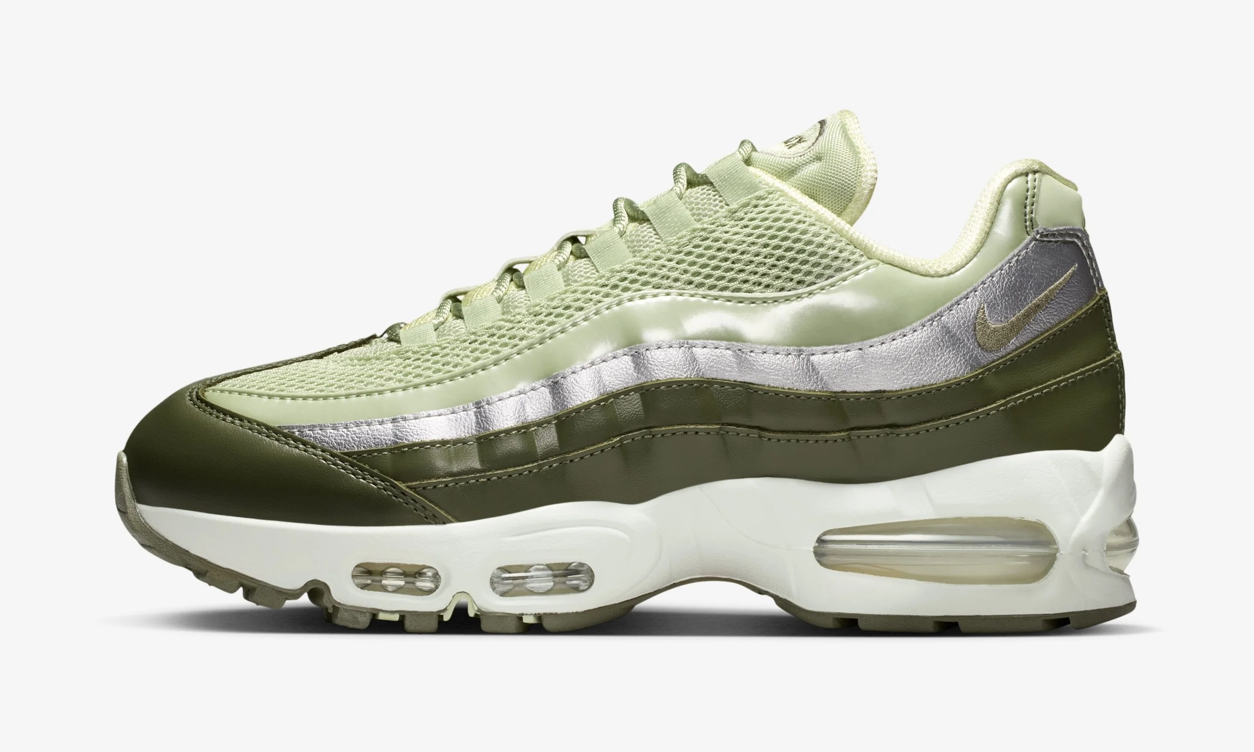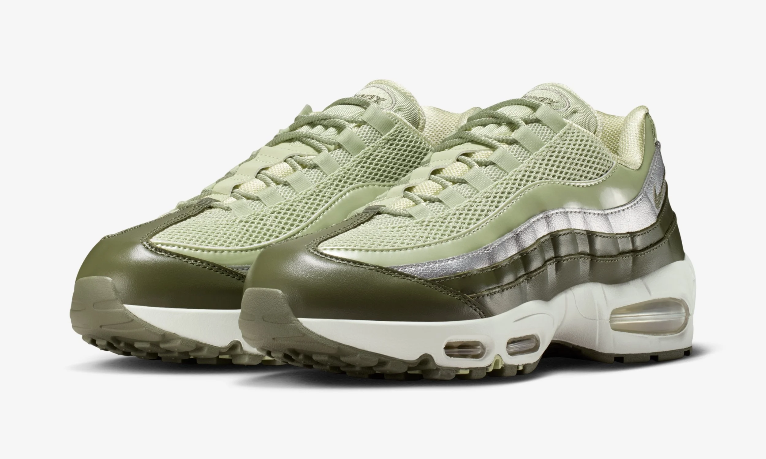 The combination of greens, greys, and silver mirrors seasonal trends while staying true to the Air Max 95’s legacy of layered aesthetics and functional design.
