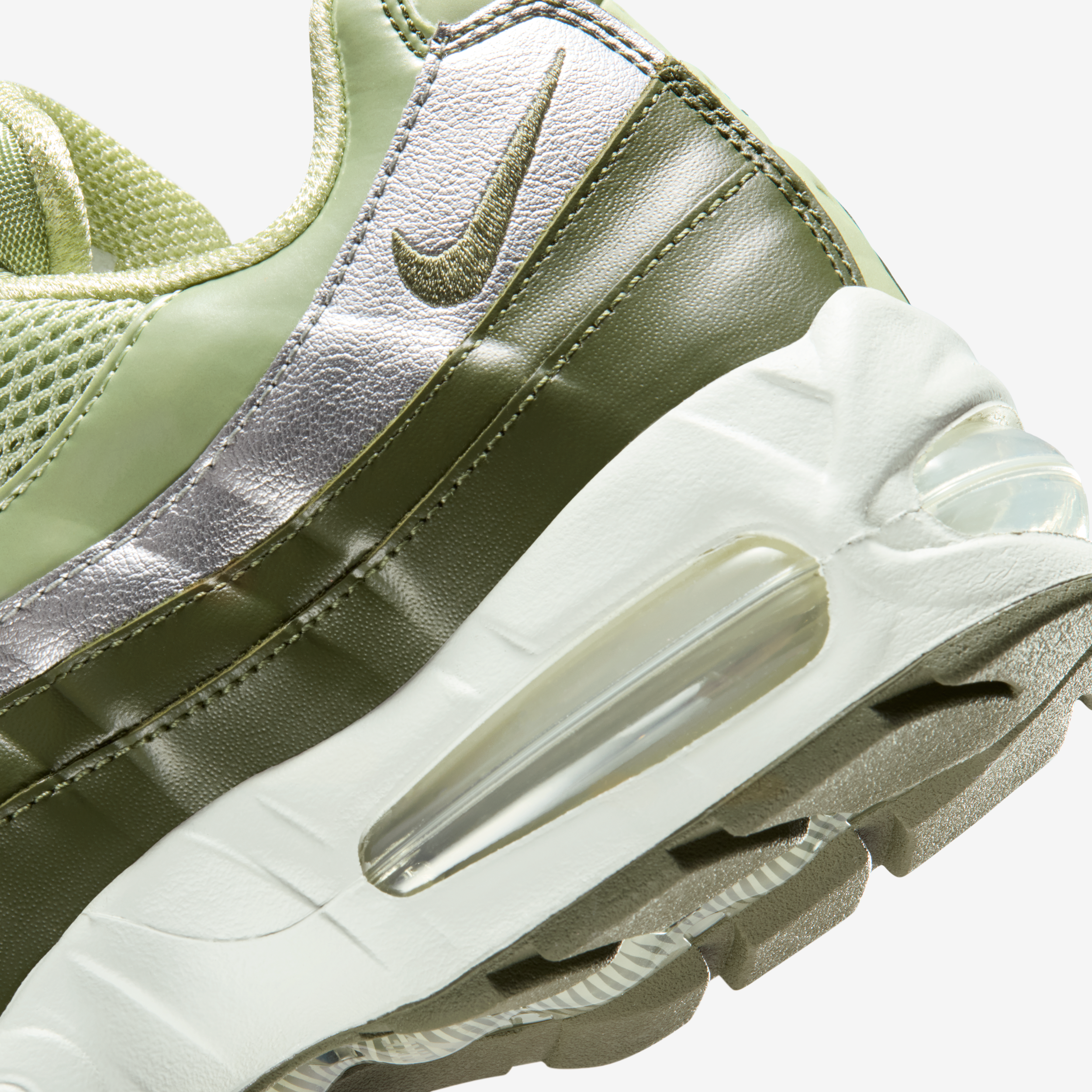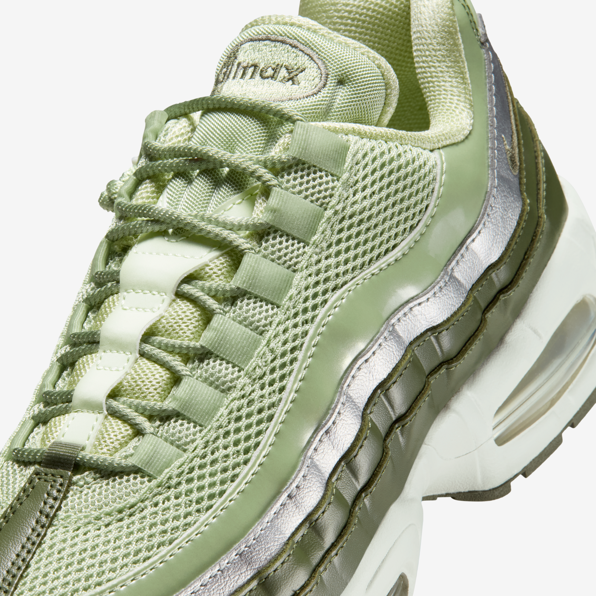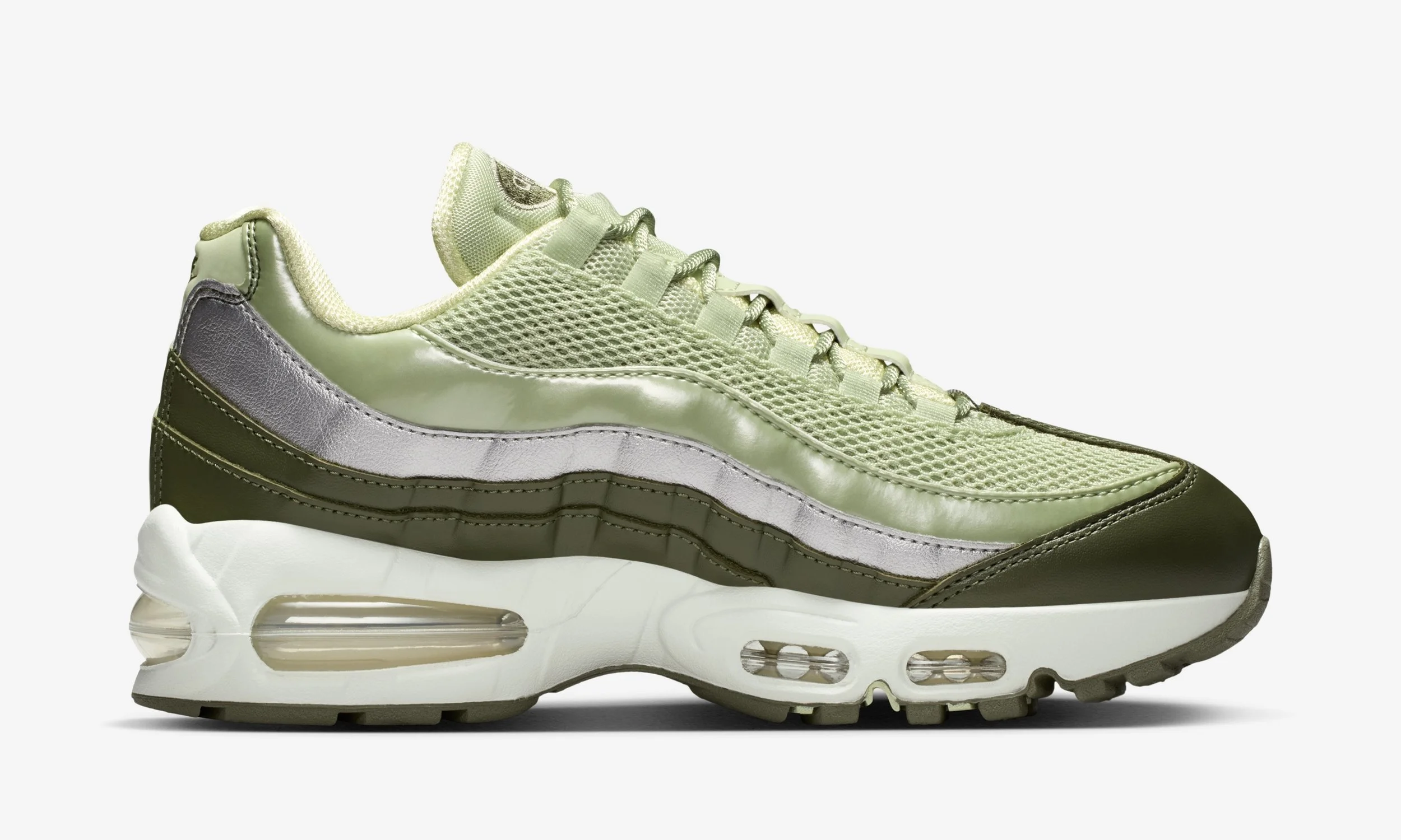 The combination of greens, greys, and silver mirrors seasonal trends while staying true to the Air Max 95’s legacy of layered aesthetics and functional design.